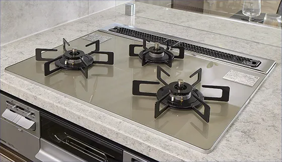 デザイン性に優れたガラストップコンロを採用しました。水無し両面焼きグリル付き3口ガスコンロです。