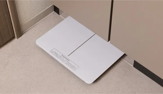 置き場所に困るヘルスメーター用に洗面化粧台の巾木部分を利用。すっきり隠せる収納スペースを設けました。