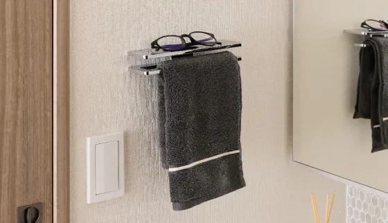 洗面横のタオル掛けには、メガネやスマホを置ける小物置きを設けました。