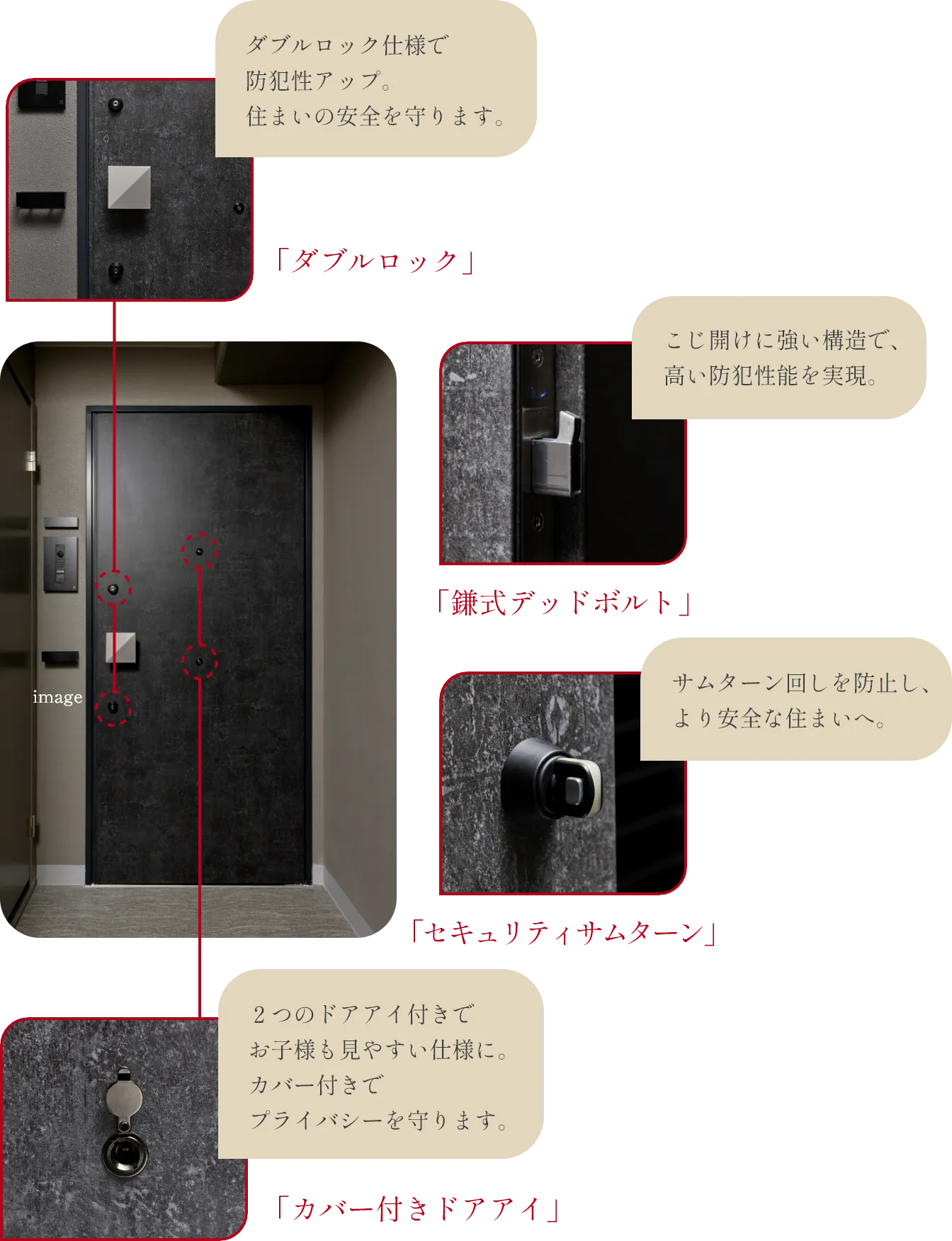 日々の暮らしの安心を支える、3つのセキュリティを設けました。エントランスのオートロックによる1次セキュリティ。非接触キーの採用でリーダにキーをかざすだけで解錠可能です。次に、2次セキュリティとして1階エレベーターホールでは非接触キーをリーダにかざすことでエレベーター扉が開き、居住階が自動登録されます。さらに、住戸玄関にはダブルロック等の防犯機能を採用し、3次のセキュリティを構築しました。また、共用部の各所に設置した防犯カメラや各住戸玄関前カメラなどのセキュリティが、日々の安全性を高めます。