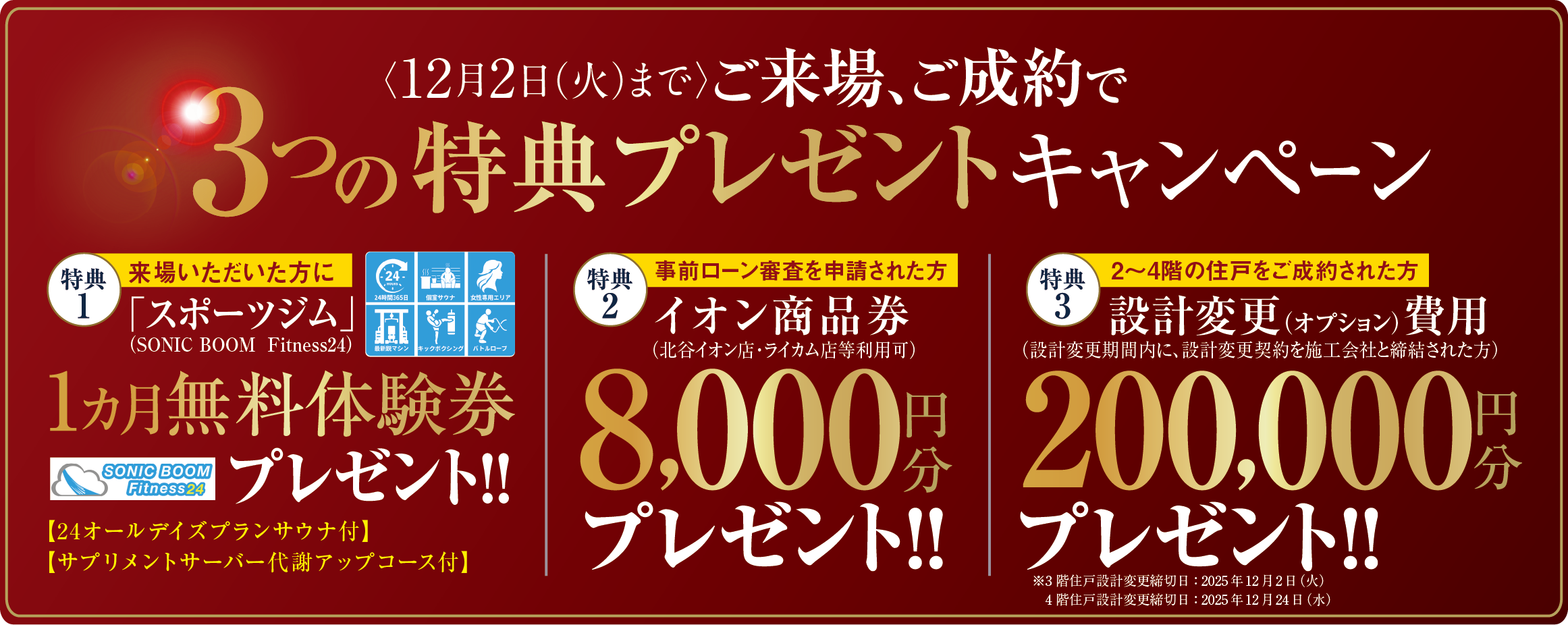 - ※特典3:キャンペーン期間内にご成約、設計変更(オプション)契約を締結した方が対象となります。