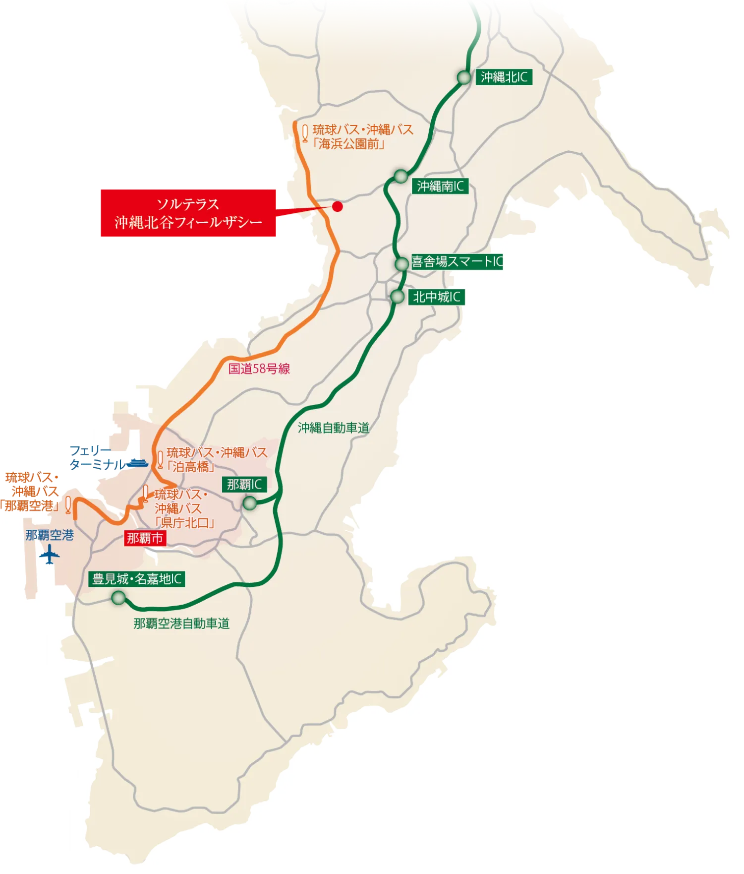 北谷町の西海岸・高台エリアに位置する「北谷伊平」は、近年区画整理事業が進んだ比較的新しい街区で、海やマリーナ、商業施設が徒歩圏内にそろう、リゾート感あふれる雰囲気が魅力です。交通面では、国道58号や沖縄西海岸道路を利用して国際通りや那覇新都心、首里など那覇市街地へアクセスできるほか、那覇空港へも沖縄南I.Cから沖縄自動車道を利用することで軽快に移動できます。