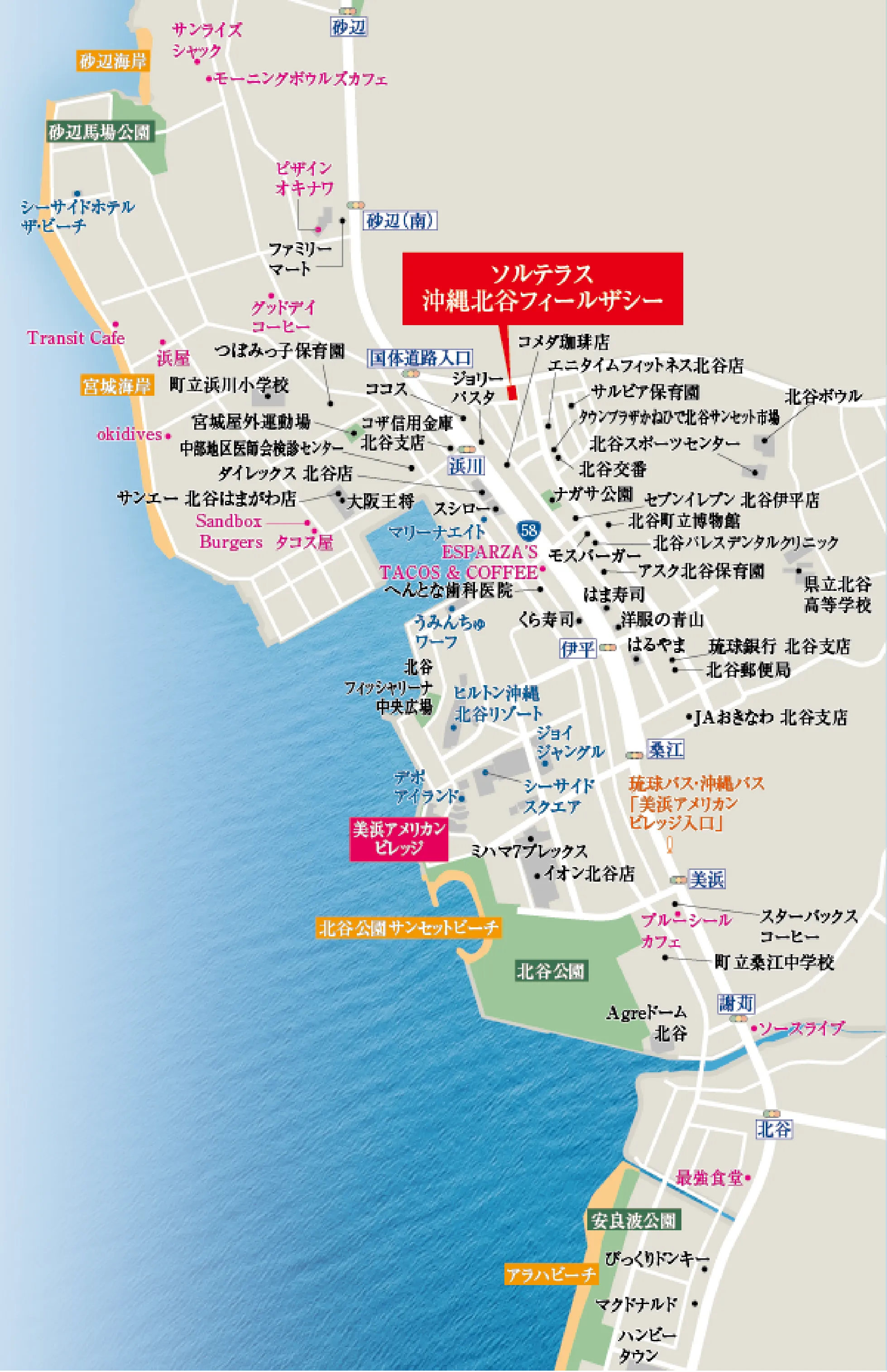 徒歩圏には「北谷町立浜川小学校」や「桑江中学校」があり、「浜川幼稚園」や認可保育園「アスク北谷保育園」も揃います。